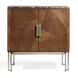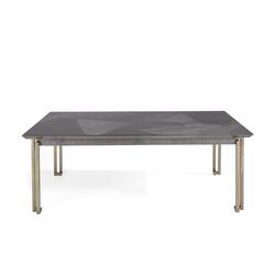 With its distinctive dining table and matching chairs, the Bond Dining Room showcases geometric shapes and irregular plate designs, defining its signature style. Crafted from fine veneers and accented with an interlaced metal base, each piece radiates elegance and sophistication. This dining set boasts a high-sheen grey pearl finish (in birdseye maple) and antique brass accents, adding a touch of refinement to every mealtime experience.