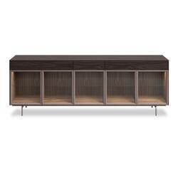 4 smoked glass doors with metal frames. Glass shelves. 2 upper upholstered drawers, one with dividers. Doors and drawers feature a touch-latch system. Dimmable 4000K LED lighting with remote control. Compatible with smart assistants.