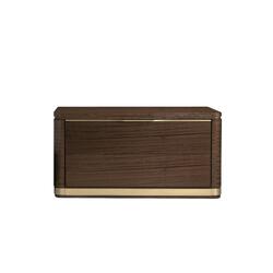 Three drawers. Upper drawer with soft-close mechanism. Bottom drawers with touch-latch system. Wood top. Metal accents on the base.