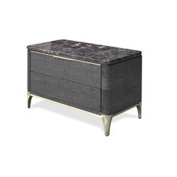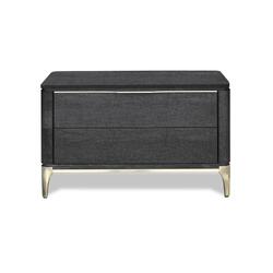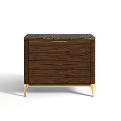 La mesita de noche Soho tiene un diseño funcional pero lleno de connotaciones lujosas, que se reafirman en el glamour con tapas de mármol o madera y frentes en piel o madera, así como tiradores y bases de latón.