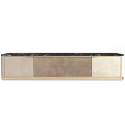 Dos puertas con cierre retardado y estantes en el interior. Un cajón central con piel en el frente, con cierre retardado. Tapa de mármol. Detalles metálicos en la base.