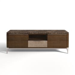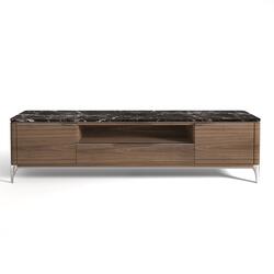 El mueble TV Soho posee un diseño funcional pero lleno de connotaciones lujosas, que se reafirman en el glamour con tapas de mármol o madera y frentes en piel o madera, así como tiradores y bases de latón.
