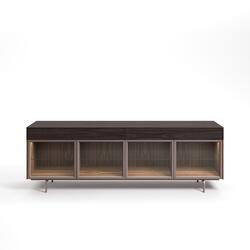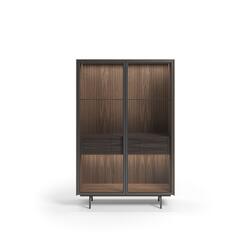 Exemplifying modern luxury, the Link dining room epitomizes sleek sophistication The dining table in walnut finish is complemented by chic, upholstered chairs that exude comfort and style. Sleek and spacious credenza and display cabinets embody modern sophistication and elevate any dining space with their timeless allure.