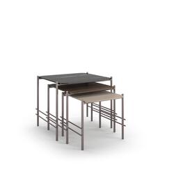 This setting stands out for its functional and contemporary design. The cocktail tables bring character with their elegant lines, the solid wood armchair combines comfort and style, and the set of nesting tables, featuring both wooden and porcelain tops, adds versatility and modernity to the space.