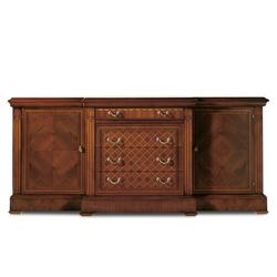An elegant style in its simplicity, exceptional in its refined craftsmanship and restricted in its decoration is the spirit of the Versailles collection. Inspired by the designs of Marie Antoinette at the Palace of Versailles, it exemplifies and expands the contrasting geometric patterns of walnut and boxwood inlays, all intricately designed. Walnut veneer, boxwood frets and marquetry, brass hardware.