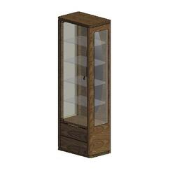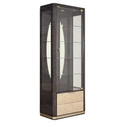 One glass door. Two drawers with leather on front. Upper drawer with soft-close mechanism. Bottom drawer with touch-latch system. LED lighting. Oval mirror in the back panel. 4 glass shelves. Metal accents on the base.