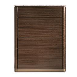Eight drawers. Upper drawers with soft-close mechanism. Bottom drawers with touch-latch system. Wood top. Metal accents on the base.