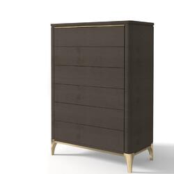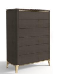 Seis cajones con piel en el frente. El cajón superior con cierre retardado. Los cajones inferiores con sistema push. Tapa de mármol. Base con patas de latón.